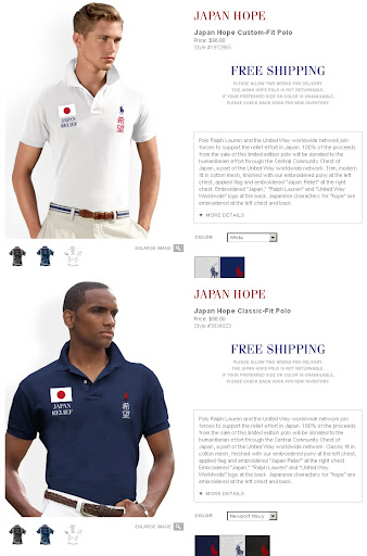 この機に便乗するかのように各ブランドがいっせいにチャリティーTシャツを売り出して、それ自体はひとつの支援の形だと思うけど、メッセージ性を高めすぎて、暴走し始めたデザインがエラいことになってます! 30秒あれば作れそうなkitsonの手抜きすぎるTシャツ&バッグに苦笑し、Opening CeremonyのTシャツに「ただの右翼じゃねぇか」と失笑したのも束の間、ラルフローレンのチャリティーポロシャツを見て愕然!(→画像) ギャー、日本好きのバカ外人! デザインって深い・・・。
